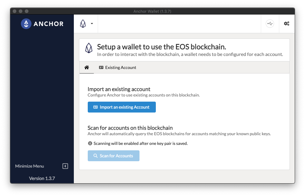 Please select any one of the listed blockchains to get started. For this tutorial, we’ll use the EOS blockchain.  Once you select the EOS blockchain, you will be presented with a screen to import an existing EOS account.